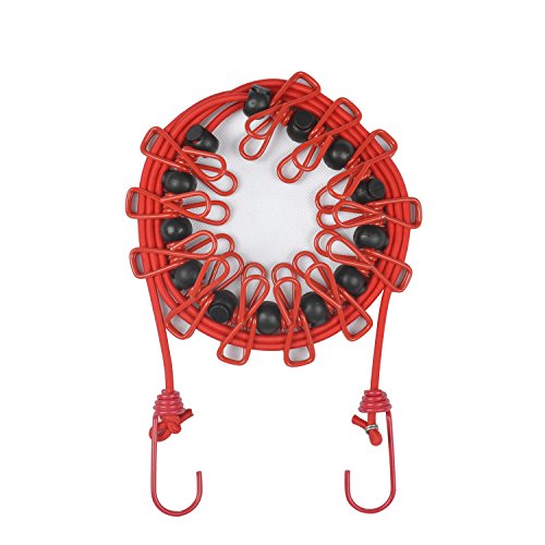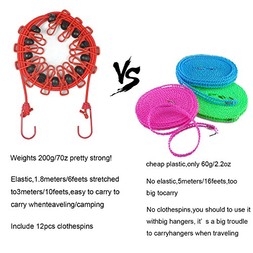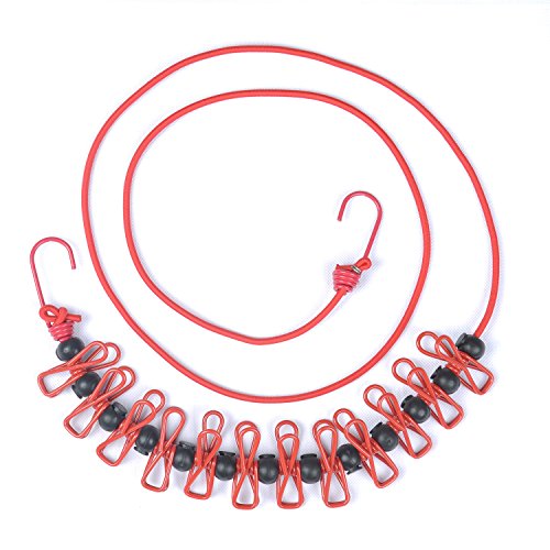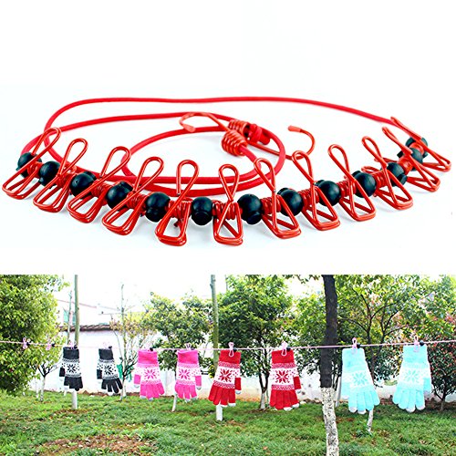 Clothesline Rope, Volla Portable Outdoor Travel Clothesline Windproof with 12pcs Clothespin and Hook End (Red)