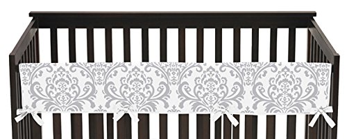 -. Feature : Features an exclusive gray and white damask P.R.Int fabric with coordinating white ties. / 100% Cotton Fabrics / Single Front Rail Guard Measures 52 in. x 18 in. / Attaches easily with secure ties. Easy machine washing and drying. / This design has matching accessories such as window treatments, hampers, shower curtains, memory photo boards, body pillow cases and decorative pillows.