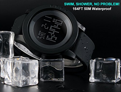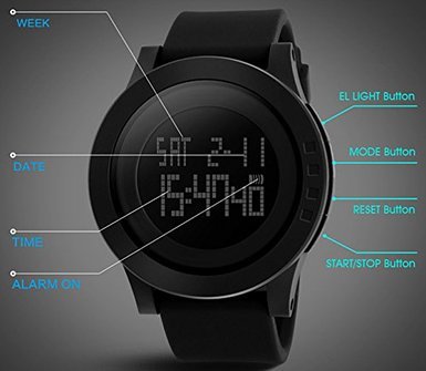 -. Feature : 164FT WATERPROOF: 164 ft waterproof (50 M) - 5ATM water resistant. NOTE: please DO NOT press any buttons in the water. / SIMPLE BLACK DESIGN: shock resistant, super easy to read, stop watch, military 12H/24H time, and LED back light functions make it perfect for all kind of sports and daily use. / COMFORT with FASHION: silicone rubber watch band with the simplicity design make it comfortable to wear and lead you to sport fashion edge. Perfect for both indoor and outdoor activities. / MULTI-FUNCTIONAL (WEEK DAY IS AUTOMATICALLY CALCULATED ACCORDING TO YEAR-MONTH-DATE SETTING) : Calendar Month / Day / Date, Alarm, Water Resistant, LED Display, Back Light, Shock Resistant, Stop Watch. / WHAT IS IN THE PACKAGE: Aposon Sport Watch x 1, Instruction Manual x 1