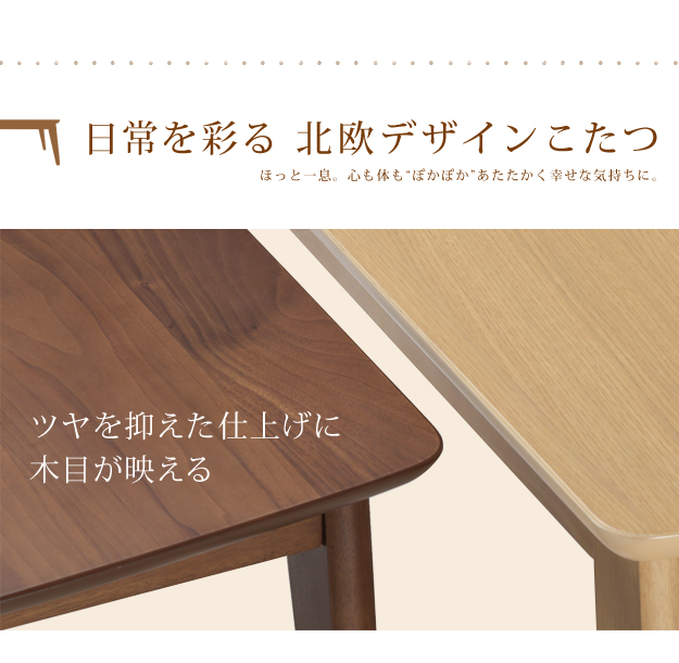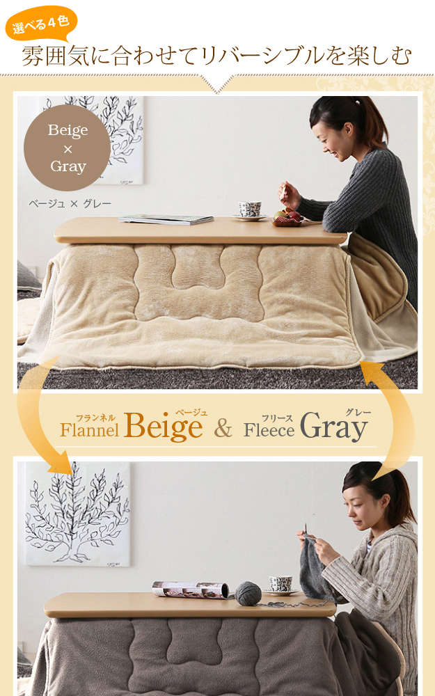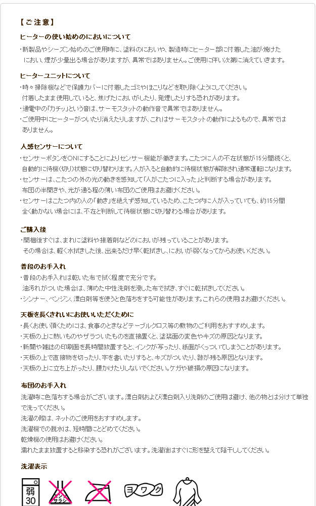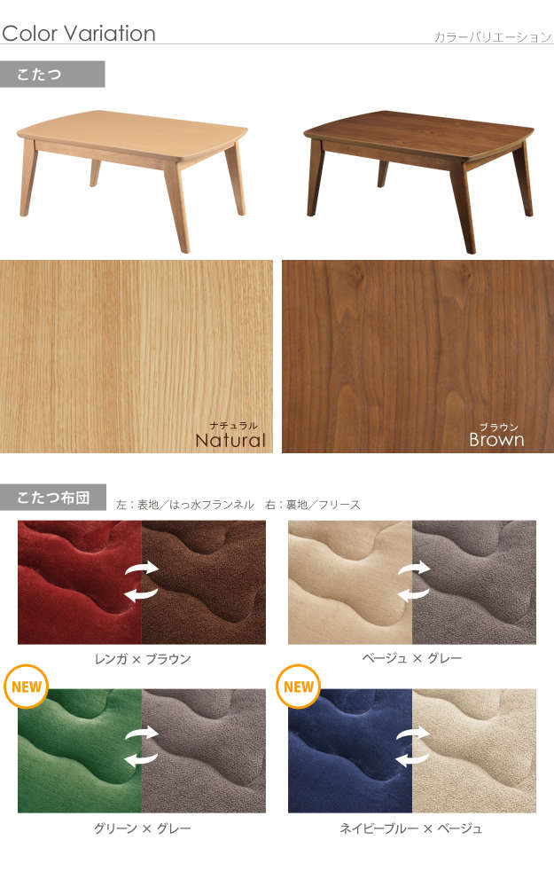 ●材質:こたつ天板-天然木化粧繊維板(ブラウン/ウォールナット・ナチュラル/楢)・ウレタン塗装、こたつ幕板・脚部-天然木(ラバーウッド)・ウレタン塗装、布団表地-ポリエステル100%(撥水フランネル)、布団コーナー・裏地-ポリエステル100%(フリース)、中綿-ポリエステル100%