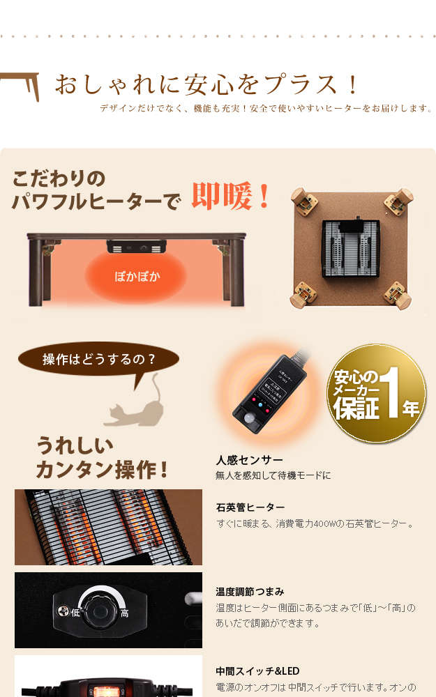 ●【人感センサー付】ファンレス石英管ヒーター(400W・中間スイッチ式)、コード長3m