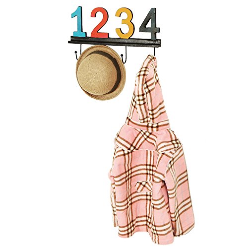 - Vintage-style wood coat rack rail with 4 hooks, colored numbers and distressed finish. Easily mounts on any wall.