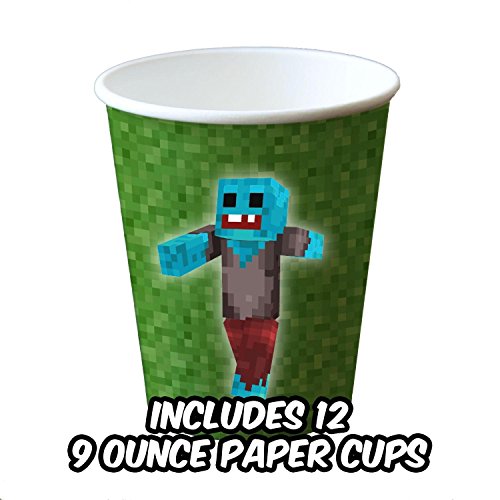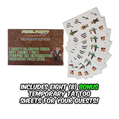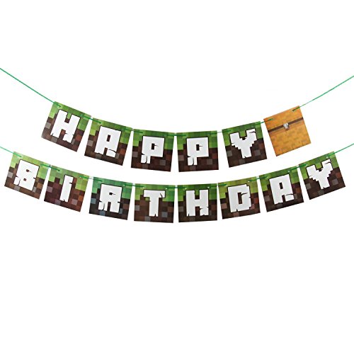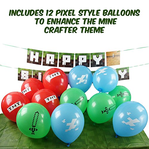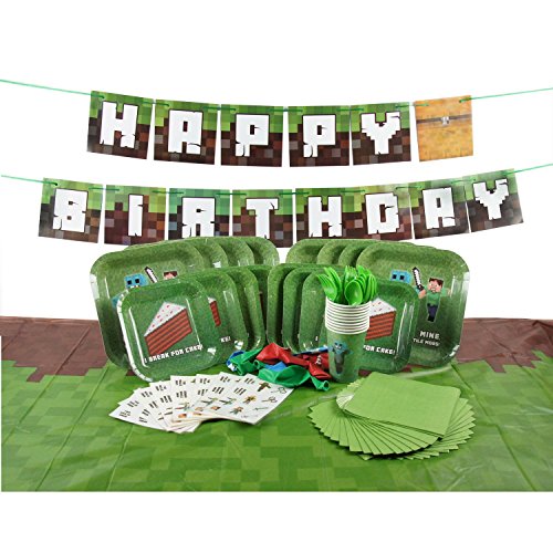 -. Title : Deluxe Tableware Set for Pixel Mine Crafter Themed Party with HAPPY BIRTHDAY BANNER! (Service for 8) - Party Supplies - Plates, Cups, Cutlery, Napkins, Balloons, Table Cloth, & 8 BONUS Gifts!