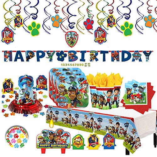 -. Title : Paw Patrol Birthday Party Deluxe MEGA Supplies Party Pack + Decorations for 16 guests (Plates, Cups, Napkins, Tablecover, Candles, Swirl Decorations, Happy Birthday Banner, Table Decorating Kit)