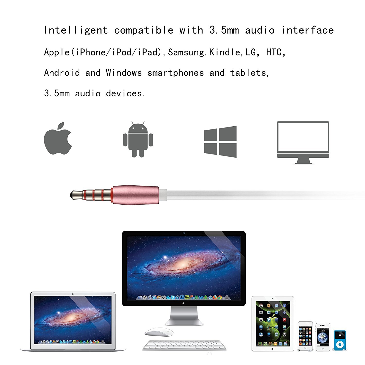 iPhone, Android, smartphone, tablet, personal computer, game machine and others, compatible with 3.5 mm earphone jack.