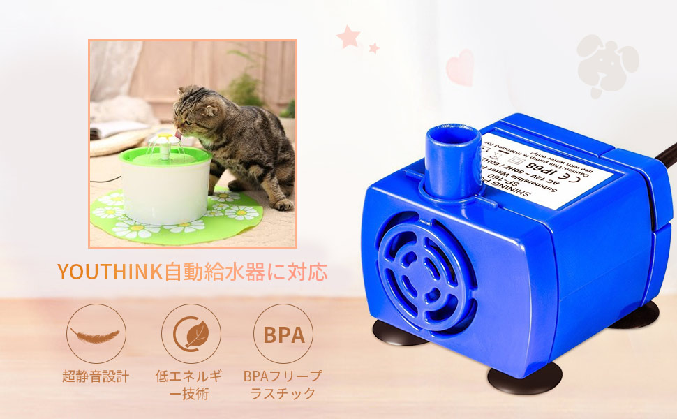 カワイイブルーの花型給水器あまたはグリーンの花型給水器でも、セラミックファウンテン式のペット給水器でも、YOUTHINKの自動給水器専用ポンプに合わせて使えば、より役に立ちます。
