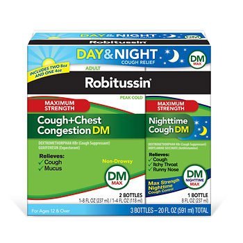 Studio : Robitussin Publisher : Robitussin Binding : Health and Beauty Product Description Because your cough never takes a break, neither does Robitussin's Maximum Strength DM Day and Night Pack. Now you can conveniently control your cough day and night, with all the power of DM Max cough liquids from Robitussin. For frequent, persistent coughs, Robitussin Cough Chest Congestion DM thins mucus to relieve chest congestion and gets your cough under control. Robitussin acts to suppress coughs and thin mucus so your cough is more productive, all with a non-drowsy formula that works even at the height of your cold. For your worst cough and cold symptoms, turn to Robitussin Maximum Strength Nighttime Cough DM to help you get the restful, cough-free sleep you need. Robitussin helps alleviate runny nose, itchy and watery eyes while also acting as a cough-suppressant to give you a restful night so you can feel better, quicker. 0