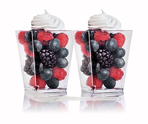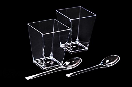 Elegant Events 5 oz square cups are ideal for beautifully presenting your prized recipes at any of your upcoming occasions. The dimension are 3"(height), 1.6"(bottom length), 2.25"(top length). The size is perfect for an individual dessert, appetizer or to server other tasty treats. 100 appropriately sized spoons are included making your presentation task that much easier. Since they are disposable you save time cleaning up. However they are durable enough to wash and reuse several times.