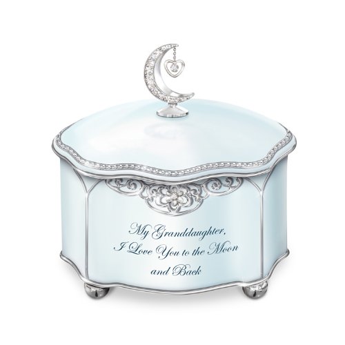 Feature : Honor the boundless love you have for her with the Granddaughter, I Love You Music Box, only from The Bradford Exchange / Expertly handcrafted of luminous Heirloom Porcelain® and gleaming with genuine platinum / Graced with a silver-plated, pave-look crescent moon, from which dangles a beautiful open heart with a faceted crystal in its center / Granddaughter music box is hand-glazed in ice blue and adorned with a crystal rosette / Features a loving sentiment that reads "My Granddaughter, I Love You to the Moon and Back" in elegant script and arrives with a poem card