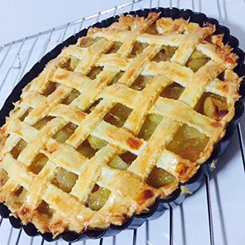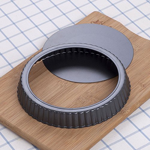 Dimension: 9.5" in top dia. x 9" in bottom dia. x 1" height Made of high-carbon steel and non-toxic non-stick coating. Removable bottom for quick cooling easy release. Dishwasher safe. Attractive fluted edges that produces a beautiful Quiche. Great for any family and parties. Perfect for quiches, tarts, and cakes, muffins, cupcakes, brownies and more baking. 0
