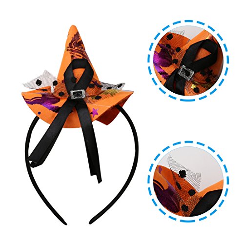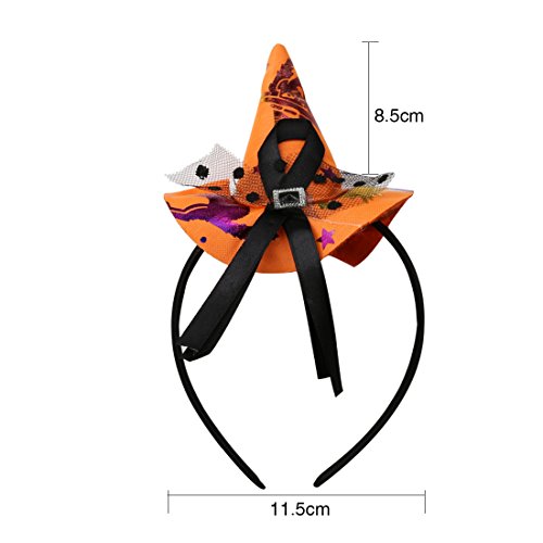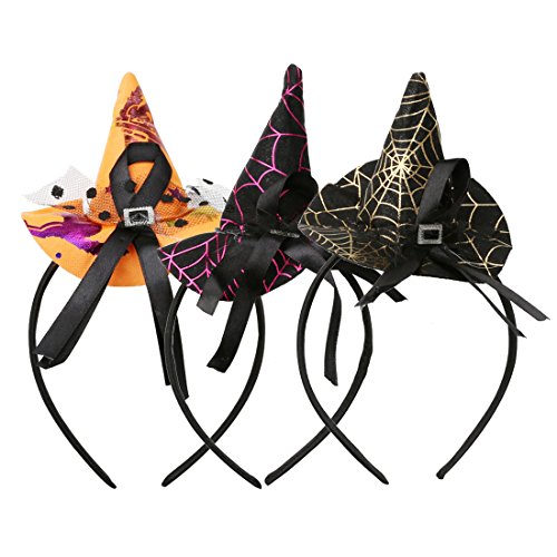 -. Feature : Containing 3pcs traditional Halloween theme prop, 3 different color witch hat great for Halloween Masquerade Party. / Size: head hoop about 4.4*4.4 inch, not very big but suitable for most people's head as it is sP.R.Ingy, both children and adults will live its playful and cute design. / Package include 3pcs Halloween theme headband, looks special and eyes-catch when you wearing it on your Halloween Party. / Light weight and easy to wear, Bright colors and unique style headband is not only for children but also fit an adult. / Suitable for many occasions, such as Halloween parties props, masquerade party, performance, costume balls, etc.