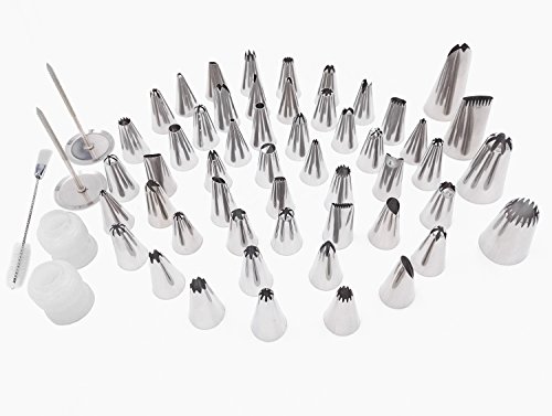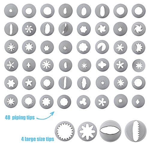 - 48 stainless steel piping tips + 4 large size tips + 2 reusable plastic coupler + 2 reusable silicone pastry bag + 2 flower nails + 1 brush