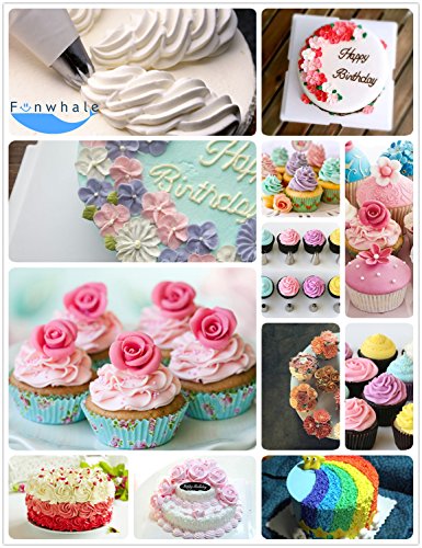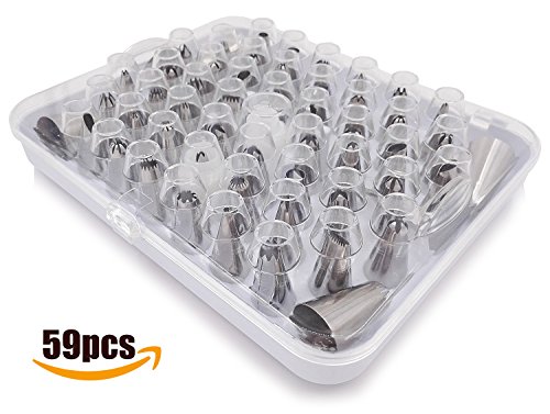 Funwhale Piping Tips,59-Piece,Stainless Steel Cake Decorating Tips Set,Icing Tips Set DIY Baking Tools with 2 Reusable Coupler,2 Silicone Pastry Bag, 2 Flower Nail,Brush and Hinged Storage Box