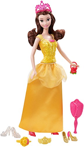 Belle absolutely dazzles in golden yellow, head to toe sparkling fashions with a uniquely "Beauty"-ful silhouette! She wears a shiny translucent rose crown, shimmery overlay on a floor length skirt and coordinating shoes