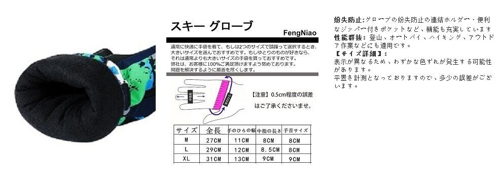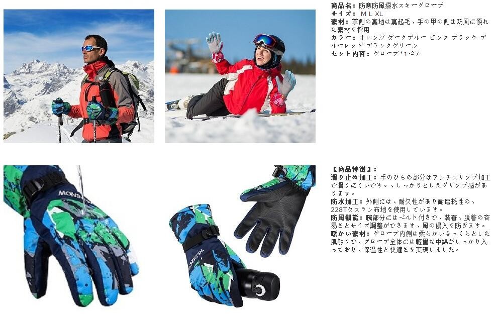 【高品質な素材】ナイロンと綿。上質な手触りと軽さ、228Tタスラン布地を外側に使用。独自の防風、撥水素材加工で撥水保持効果を確実にし、あなたの手を乾いたまま温かく保ちます。エルゴノミック設計で手の平にぴったりフィット。あらかじめカーブした指の部分で、よりしなやかで動きやすい。【保温性が優れた】内側は起毛加工が施されて、3M極細断熱素材は熱の流出を減らし、通気性と保温性を両立し、湿気をのがして、体温の暖かさを留めます。寒い冬にも山登り、バイク、スキー、通勤、通学、除雪、雪かき、サイクリングなどアウトドアも安心。【すべり止め設計】手のひらの一部には耐摩耗、滑り止め加工も施してますので物を掴む際にもしっかりホールドできます。ウィンタースポーツを楽しんでいる間中しっかりと握れて安全です。スノーボード、スキー、その他いろいろに。【防風機能】腕部分にはベルト付きでサイズ調整もできる、しっかり装着でき、手袋の着脱も簡単、サイズ調整可能。保温及び雪の進入を防ぐことができ、左右連結フックも付き、 携行にも便利。