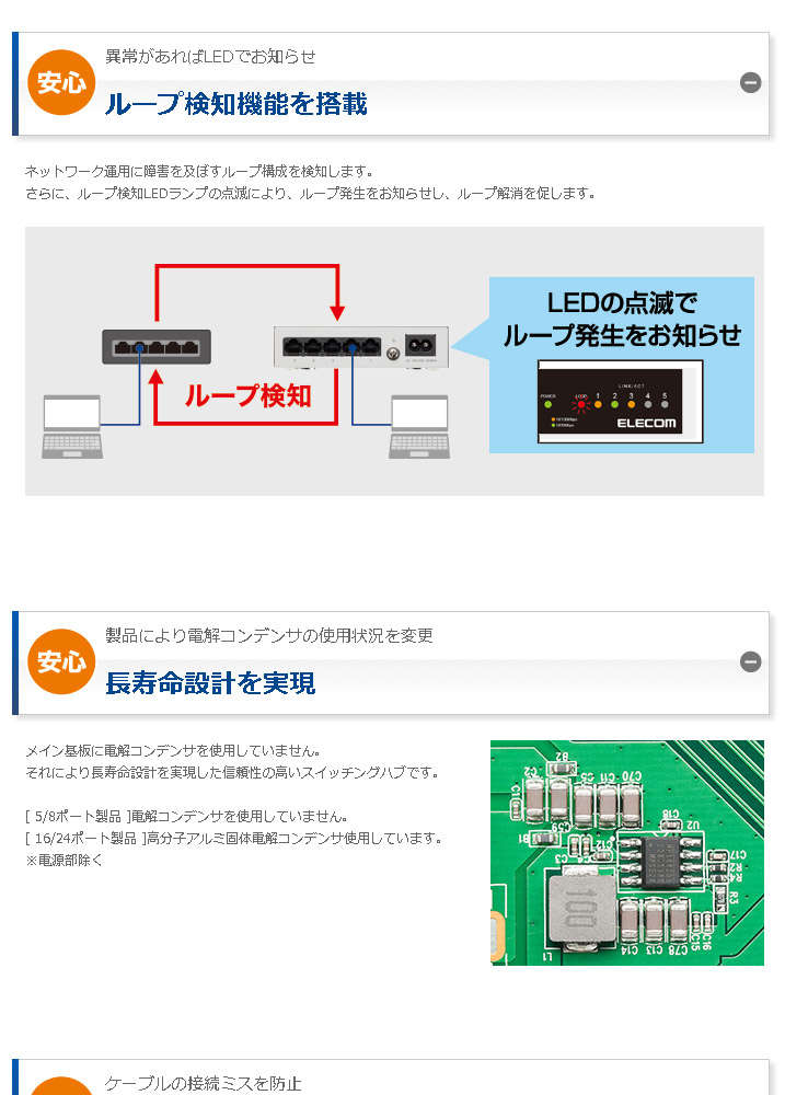 ●メイン基板に電解コンデンサを使用せず、長寿命設計を実現した高信頼性なスイッチングハブです。