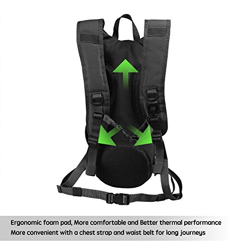 -. Feature : REPLACEABLE 2.5 L BLADDER - With 2.5 liters of water, sports drink, or any other beverage for all day long use with our hydration bladder. Included a wide screw cap and insulated tube, taste-free. / Extra Features - 3 adjustable straps to fit from kids or teens up to adults. Soft air mesh back and foam padded shoulder straps make you feel extremely comfortable during your trip. / Quality Material - Heavy-duty 600 Denier Polyester construction, durable plastic buckle and PVC lining, Streamlined, resistant to tears and abrasion. / Pockets For Storage - 18.11" x 8.27" x 2.95" in size. ONE main pocket fits up to 2.5 L water reservoir, TWO front packets to carry your wallet, keys, phone, towel, or small tools. / Versatile Hydration Backpack - Ideal for hiking, running, biking, walking, all-mountain riding, canoeing, or any other outdoor activity.