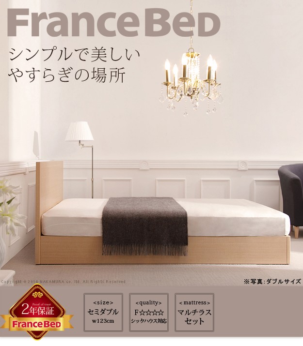 材質:[ベッド]本体-プリント紙化粧合板、[マットレス]張地-ポリエステル64%・綿27%・レーヨン9%、中身-ウレタンフォーム・パームパッド・ポリエステル綿・防虫不織布、コイル-マルチラススーパースプリング・コイル数1026、通気孔-アイレット加工