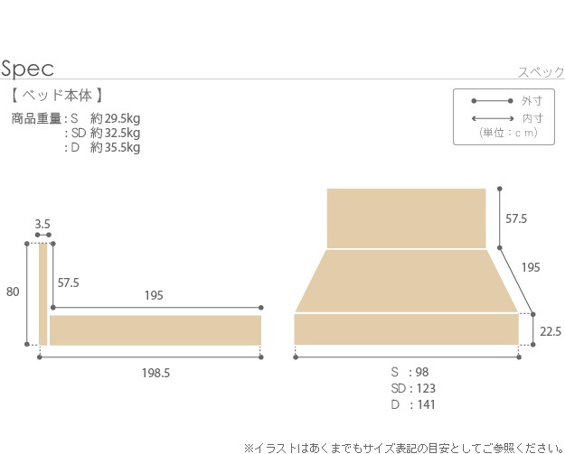 サイズ(cm):[ベッド]幅123x奥行198.5x高さ80(床板高さ22.5)cm・約33kg、[マットレス]幅122x奥行195x高さ16cm・約20kg