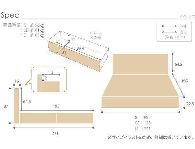 外寸:幅123x奥行211x高さ87cm/重量:約61kg