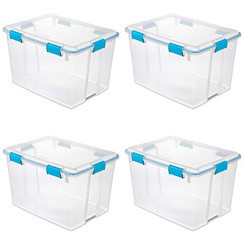 This 4 pack of Sterilite 54 Quart Gasket Boxes includes 4 clear, plastic storage containers that are great for organizing paperwork, school projects, photographs, or even clothing in your home or office. This storage box has gasket seals lining the lid, which keep your items secure. The seals are resistant to air and moisture and keep pet food and bulk foods fresher for longer. The clear plastic base and lid make it easy for you to see the contents, so you don't have to dig around to find what you need. The handles are comfortable and optimal for transportation. Store your items safely and protect them from air and moisture in the Sterilite 54 Quart Gasket Box.Feature