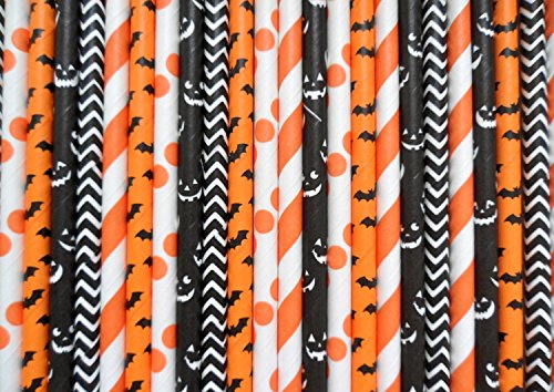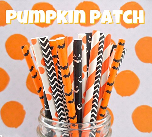 Charmed orange and black Halloween paper straw in pumpkin jack o lantern, bat, polka dot, chevron, stripe design. Pack of 125
