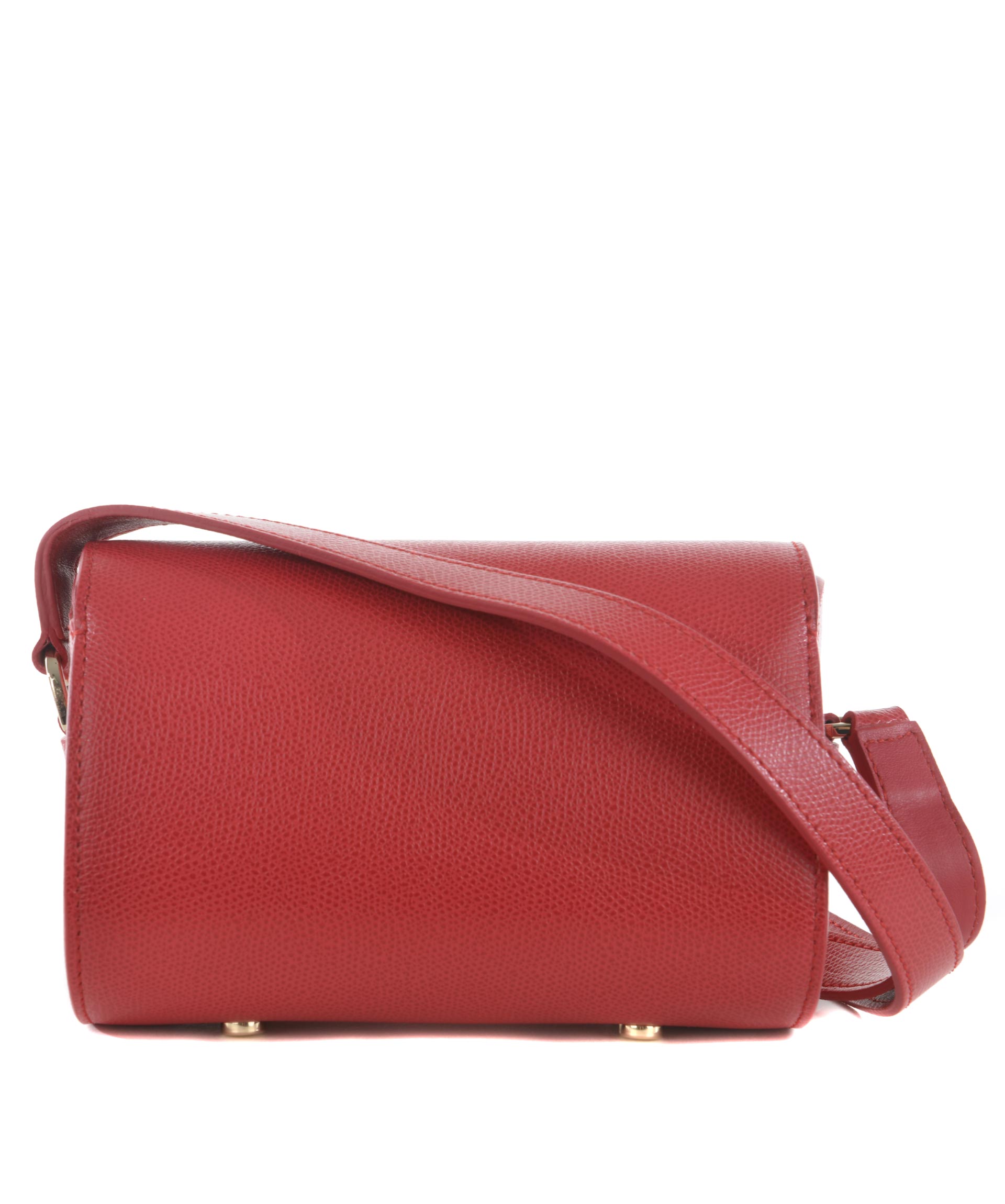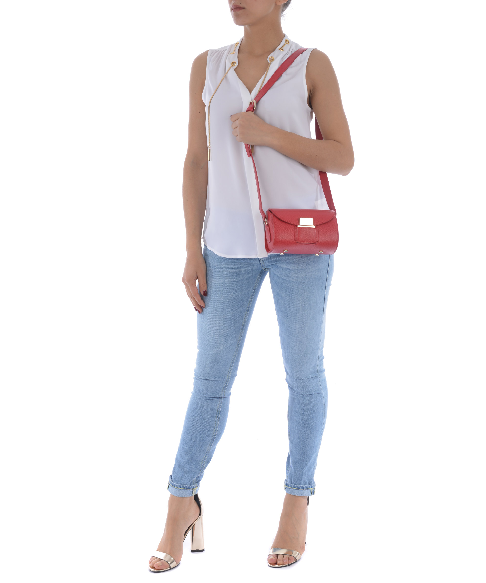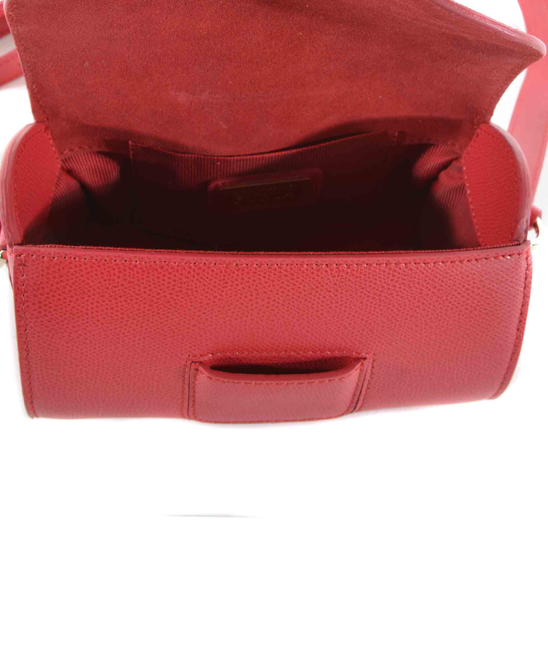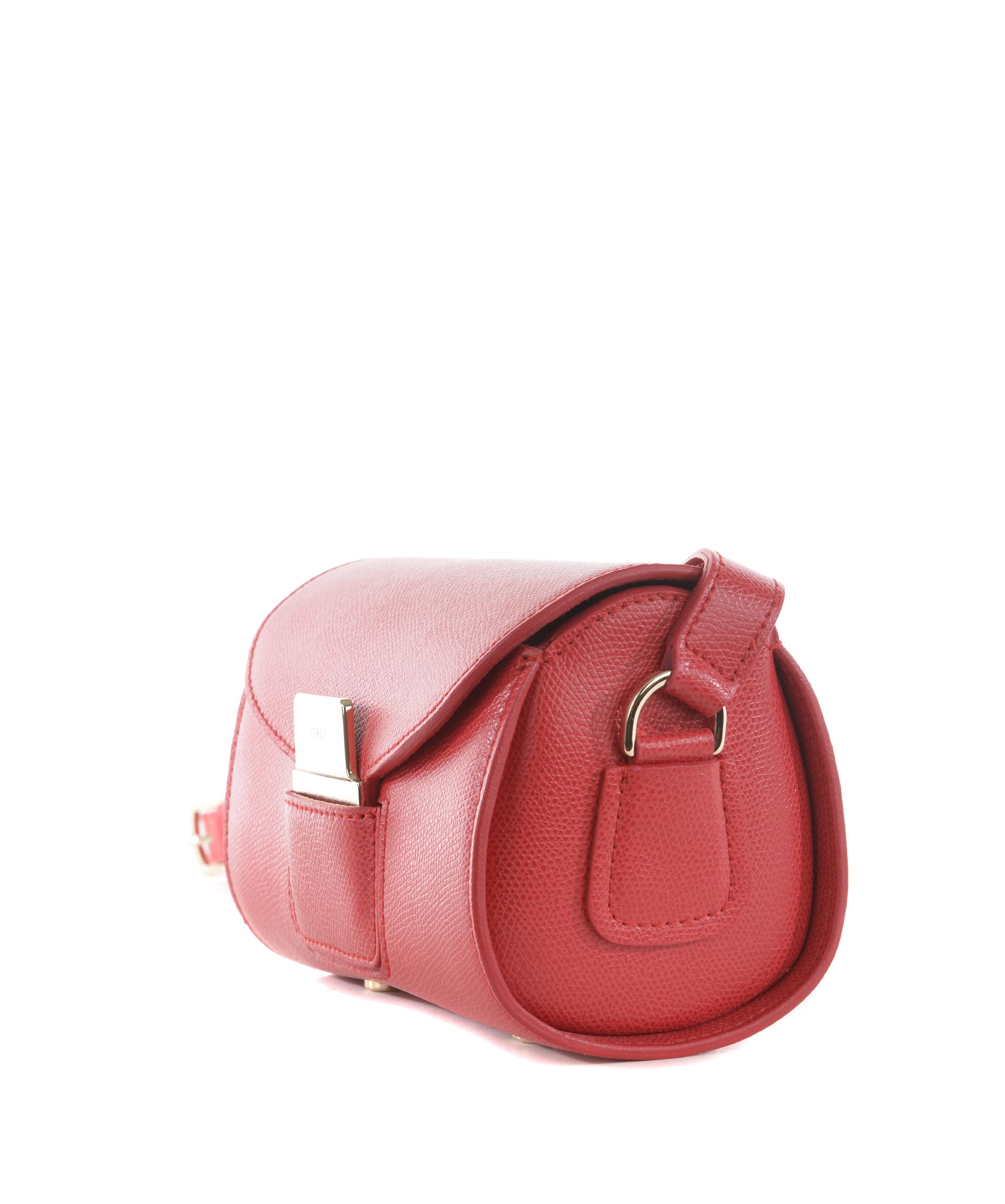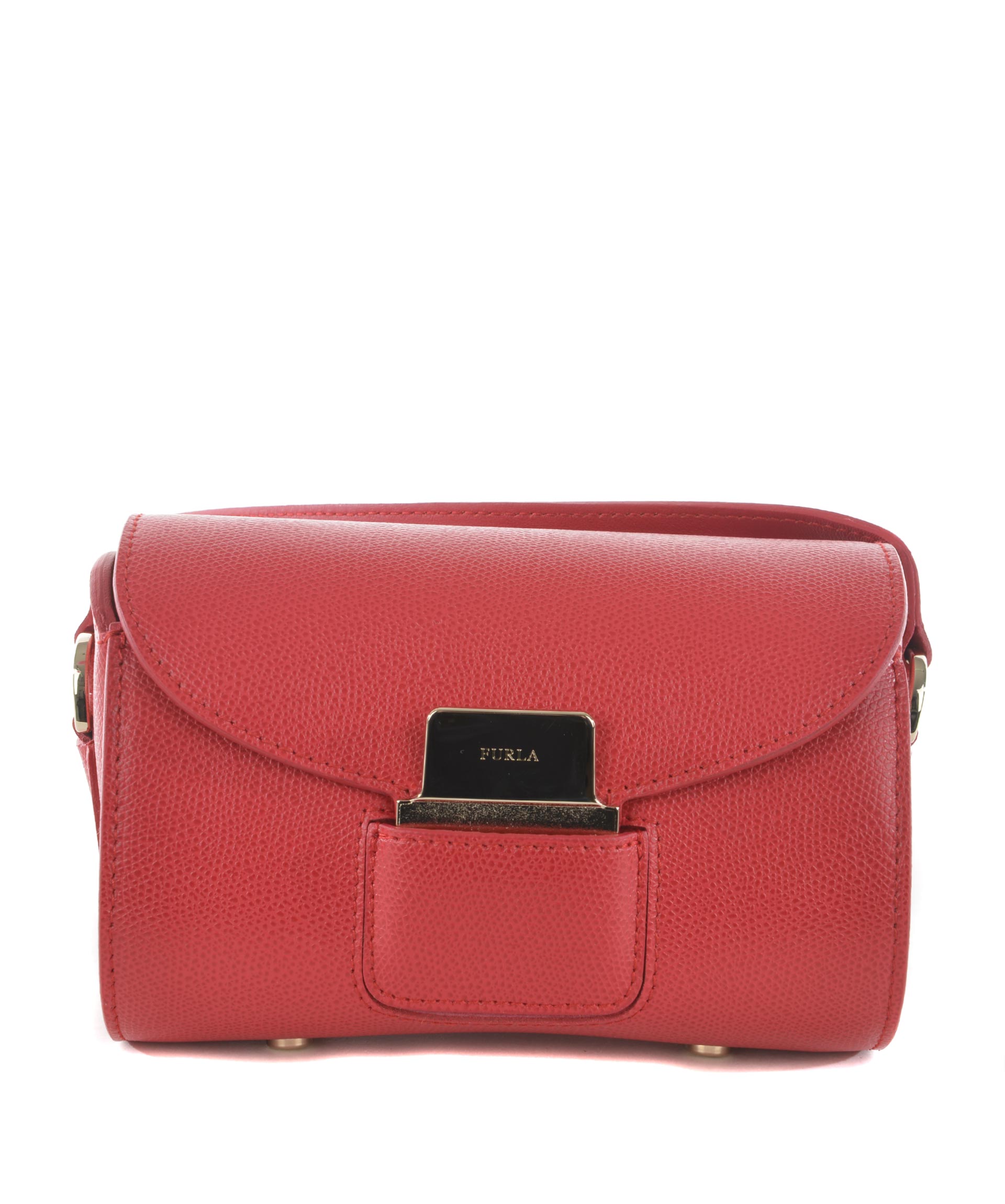 Pochette Furla in pelle Rubino. Tracolla in pelle regolabile. Patta frontale con chiusura ad incastro. Tasca interna applicata. Foderata. Placca logo frontale in metallo dorato. Piedini metallici alla base.