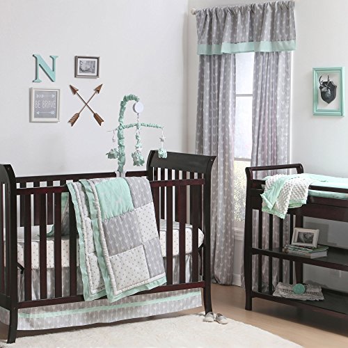 -. Feature : 100% cotton sateen fabrics highlight this premium quality patchwork of mint green woodland P.R.Ints and grey arrow, chevron, and triangle dot designs; 4 piece set includes reversible quilt, fitted sheet, tailored dust ruffle, and musical mobile; individual components of this set are also available for purchase separately / Generously sized at 44 by 37 inches, the 100% cotton quilt will find a host of uses in and out of the nursery, inside and outside the home; perfect for tummy-time / Crib skirt, with a 14 inch drop, and the fitted crib sheet are designed to fit a standard sized crib with a mattress measuring 52 by 28 inches; all-around elastic will assure that the sheet fits safely and securely every time / Musical mobile features elephants, clouds, and stars and plays a gentle lullaby to soothe baby to sleep / The Peanut Shell, through this mix and match collection, offers a host of coordinating items for your nursery, including: window treatments, crib rail guards, blankets, alternate sheets, and changing pad covers