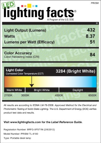 -. Binding : Tools & Home Improvement -. Brand : P.R.Ism -. Color : White -. EAN : 0887071000081 -. Feature : Energy Efficient 8.37 W / ENERGY STAR / 3 Step Touch Dimming Control System / 25 Years of Life Span Under Normal Use / Space Saving Design Folds into Night Light Mode / LG Lumiplas Technology brings Uniform Non-Glare Illumination -. Label : PlanLED -. Manufacturer : PlanLED -. Model : TL-4100WH -. MPN : TL-4100-WH -. NumberOfItems : 1 -. PackageQuantity : 1 -. PartNumber : TL-4100-WH -. ProductGroup : Home Improvement -. ProductTypeName : HOME_LIGHTING_AND_LAMPS -. Publisher : PlanLED -. Studio : PlanLED -. Title : P.R.ISM TL-4100WH Energy Star LED Desk Lamp with Anti-Glaring Filter, White -. UPC : 887071000081 -. Warranty : 3 year Standard Manufacturer Warranty