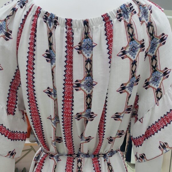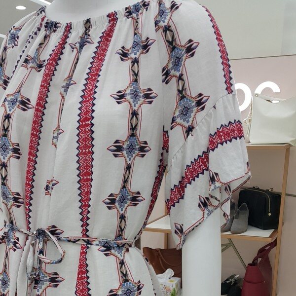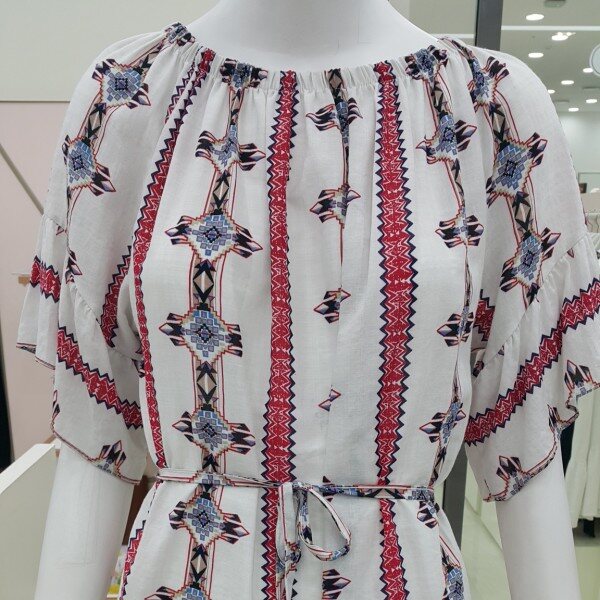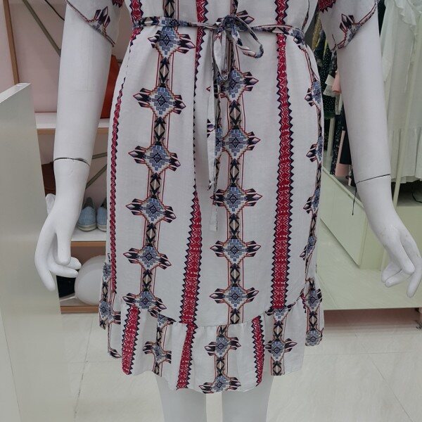 면 50%, 레이온 50% 혼장소재의 세로 에스닉패턴 원피스입니다.충분한 길이감과 시원하고 가벼운 소재로 데일리로 연출하기 쉬운 제품입니다.끈을 이용해 허리라인을 강조하면 한층 더 여성스러운 분위기를 연출할 수 있습니다.세련된 패턴과 프릴 소매로 단조롭지 않은 디자인입니다.가슴둘레 : 110총기장 : 83