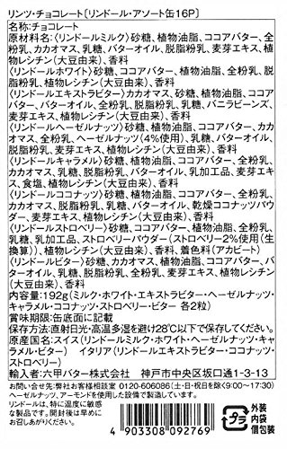 原材料:<リンドールミルク>砂糖、植物油脂、ココアバター、全粉乳、カカオマス、乳糖、バターオイル、脱脂粉乳、麦芽エキス、植物レシチン(大豆由来)、香料 <リンドールホワイト>砂糖、ココアバター、植物油脂、全粉乳、脱脂粉乳、植物レシチン(大豆由来)、香料 <リンドールエキストラビター>カカオマス、砂糖、植物油脂、ココアバター、バターオイル、全粉乳、脱脂粉乳、乳糖、バニラビーンズ、麦芽エキス、植物レシチン(大豆由来)、香料 <リンドールヘーゼルナッツ>砂糖、植物油脂、ココアバター、カカオマス、全粉乳、ヘーゼルナッツ(4%使用)、乳糖、バターオイル、脱脂粉乳、麦芽エキス、植物レシチン(大豆由来)、香料 <リンドールキャラメル>砂糖、植物油脂、ココアバター、全粉乳、カカオマス、乳糖、脱脂粉乳、バターオイル、乳加工品、麦芽エキス、食塩、植物レシチン(大豆由来)、香料 <リンドールココナッツ>砂糖、植物油脂、ココアバター、全粉乳、カカオマス、脱脂粉乳、乳糖、バターオイル、乾燥ココナッツパウダー、麦芽エキス、植物レシチン(大豆由来)、香料 <リンドールストロベリー>砂糖、ココアバター、植物油脂、全粉乳、乳糖、乳加工品、ストロベリーパウダー(ストロベリー2%使用(生換算))、植物レシチン(大豆由来)、香料、着色料(アカビート) <リンドールビター>砂糖、カカオマス、植物油脂、ココアバター、バターオイル、乳糖、脱脂粉乳、全粉乳、麦芽エキス、植物レシチン(大豆由来)、香料