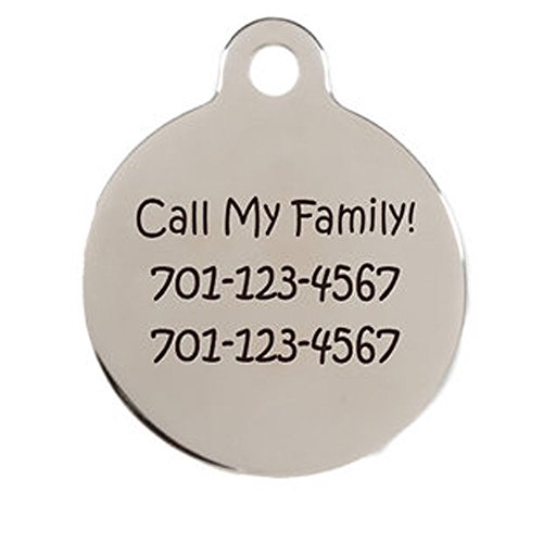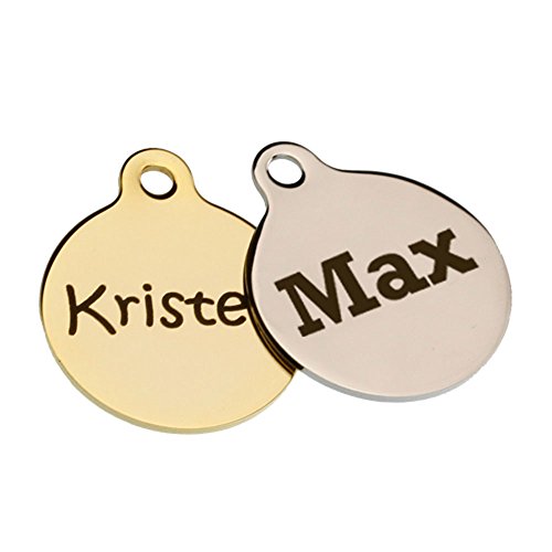 These elegant 24k gold plated or nickel plated solid brass dog is tags offer you the best of both worlds in personalization. On one side you can display your dogs name in big lettering and on the other you can add up to 4 lines of engraving. The additional 4 lines will give you plenty of room for important contact info to help keep your dog safe if he/she goes missing. Customize your Dog ID Tag with your chosen font!ENote that the same font is used on both sides and our laser engraver will always center your text on the tag. Available in small 1" diameter for small toy breeds or large 1 1/4" diameter for medium to large size breeds. Includes matching s-hook and split ring for your choice of attachment. 0 |