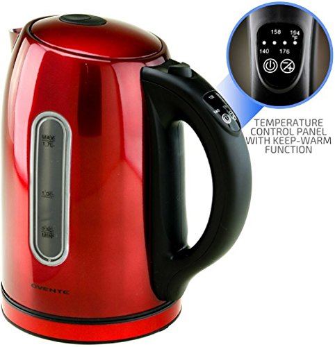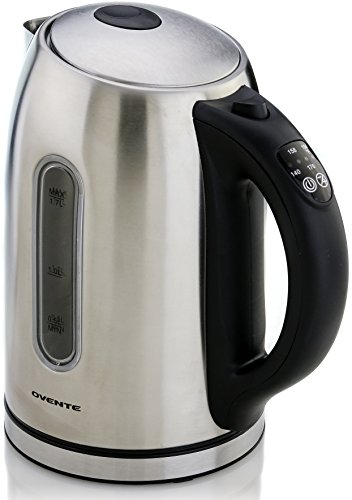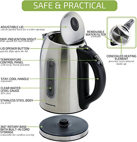 The Ovente KS89 Stainless Steel Electric Kettle flatters any kitchen countertop and is available in 3 different colors: brushed (silver), dark cherry red, and chocolate brown. It comes with a 1 YEAR WARRANTY, so rest assured, Ovente has your back.With a 1.7L capacity and 1100W of power, it quickly boils water for coffee, tea, instant macaroni and oatmeal, etc. It's proven to be 50% more efficient than stovetop kettles in reducing your daily electricity use, and has a concealed water heating element to prevent extra mineral build-up, a flip-back lid for convenient filling, and a removable/washable spout filter. For safety purposes, this kettle is equipped with Automatic Shut-Off, Boil-Dry Protection, secure locking lid, power on indicator light, cool touch button and a comfortable stay-cool handle.