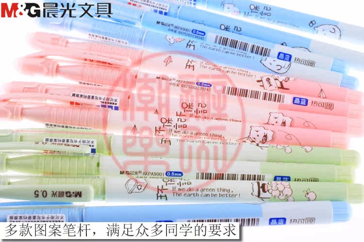 特点:清新系的笔杆,可爱的卡通图案。写错了用笔帽或尾部橡胶擦一擦,环保行动你我他。为了家园更美好,让环保流行起来。
