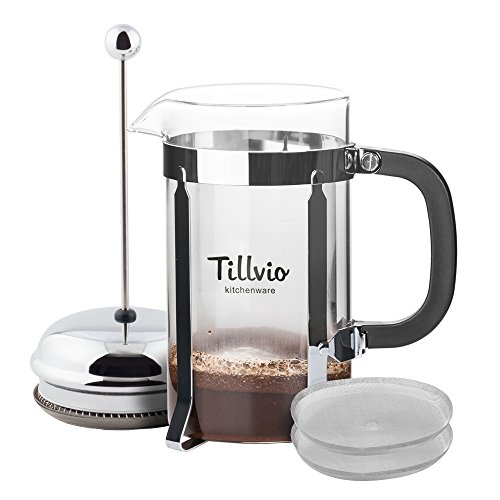 -. Title : Tillvio French Press - Large Coffee Maker with Extra Durable Glass, Enhanced Filtration and 2 Replacement Filters for Easy Brewing and Original Taste - 8 cup