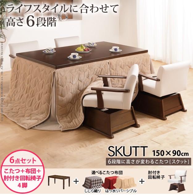 ※メーカー直送のため代金引換はお受けできません。※沖縄・一部離島は別途送料がかかります。お見積もりいたしますのでお問い合わせ下さい。セット内容:こたつx1台、こたつ布団x1枚、肘付回転椅子x4脚薄型石英管ヒーター(600W・中間スイッチ式)、コード長3mサイズ(cm):こたつ-幅150x奥行90x高さ70(45/50/55/60/65)・約35kg、椅子-幅57x奥行54x高さ72(67)・約10.5kg、布団-310x250cm椅子カラー:ホワイト布団バリエーション:しじら織り・レンガxブラウン・ベージュxグレー材質:こたつ天板-天然木化粧繊維板(楢)、こたつ幕板・脚部-天然木(ラバーウッド)、椅子本体-天然木(ラバーウッド)、布団表地-しじら/綿100%、レンガ・ベージュ/ポリエステル100%(撥水フランネル)一部組立品(脚部取付)株式会社ナカムラ(I-3302109)