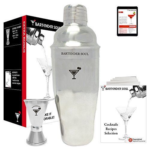 -. Feature : ✅ GET PERFORMANCE DELIVERED: Extra 25oz Size; Practical Strainer Built In the Middle Lid; Versatile Measuring Jigger Glass Marked to 1 & 0.7oz in the Greater Volume and to 0.5 & 0.3oz in the Smaller One; Engineered Anti-Leakage; Solid 0.8mm Thickness Strong Against Deformation; 18/8 304 Real Quality Anti-Rust Stainless Steel; BPA Free; Dishwasher Safe; Ensure the Success You Deserve / ✅ MAKE FANCY COCKTAILS FOR FUNNY EVENTS: This Exceptional Bartending Kit Makes the Perfect Mixes. Completed with a Gift Box and Ready to Go Recipes Booklet as well as an Emailed Book. Easily Make Charming Manhattan, Pina Colada, Cosmopolitan, Martini, Zombie, Sidecar, Aviation, Bloody Mary, Mojito, Paloma, Margarita... and all the cocktails you've always wished for. / ✅ IMPRESS YOUR CLIENTELE AND COLLEAGUES. Its Chrome Plated Finish is Perfect For Your Restaurant or Kitchen; With a Cute Registered Unique Modern Martini Glass Logo Fashioned to Your Liking; Handy and User Friendly, it is Also an Ideal Gift for "That Person" You Are Thinking About. / ✅ RISK FREE 100% MANUFACTURER GUARANTEED: Customer Satisfaction First; Bartender Soul® Professional Cocktail Shaker Set is backed by 30 Days Money Back or Replacement As Well As FREE 7 Years NO-Rust Warranty. / ✅ EVOLVE YOUR COCKTAILS WITHOUT LIMITS. Compatible With The Complete Collection, It Can Be Perfectly Used With Any Other Bartender Soul® Product. Just Click On the "Bartender Soul" Brand Link Above To Access More Options.
