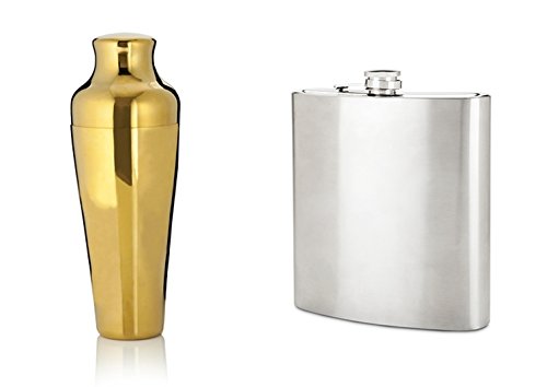 -. Title : Gold Cocktail Shaker and Oversized Flask, Set of 2
