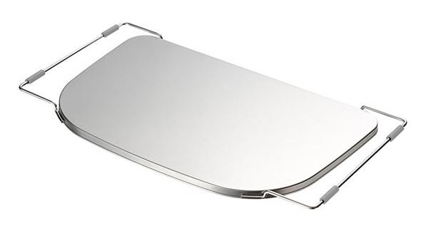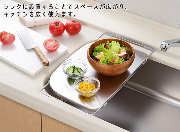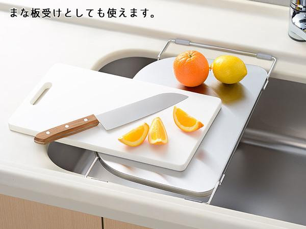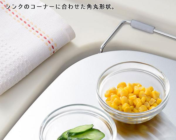 | シンクの中に、天板とほぼ同じ高さの調理スペースを広げることが出来るトレー。D型形状のシンクのコーナーにフィットします。洗い桶が下に置ける浅型形状。 |