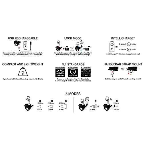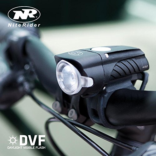 Studio : NiteRider Publisher : NiteRider Binding : Misc. Product Description Durable and lightweight, the NiteRider Swift 450 Front Bike Light packs signifcant punch with 450 lumens of exceptional brightness.FL1 Standard IP64, dust- and water-resistant.Charge time: 1 Amp, 1.75 hours; 500mA: 3.5 hours.Battery life on high: 1 hour and 30 minutes.Battery life on low: 9 hours.Battery life flashing: 9 hours and 30 minutes.Weight: 2.9 oz.. 0
