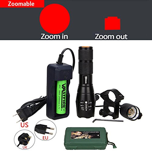 - ★ Red Hunting Flashlight Kit Includes 7 Fittings: ①VASTFIRE Red Hunting Flashlight, ②18650 Rechargeable Lithium Battery(2400mah), ③18650 Battery Charger, ④Remote Pressure Switch, ⑤Rail Barrel Mount,⑥Flashlight Packing Box, ⑦cylinder to use AAA battery