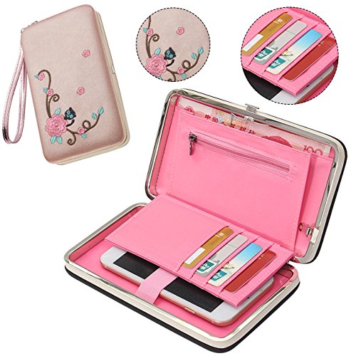 -. Feature : Premium Material --- Made of High Quality Premium PU Leather (Shell Fabric) and Polyester (Lining), Lightweight, Wear-resisting and Durable to Use / Multi Functions --- 1 x Cash Room, 1 x Zipper Coin Pocket, 1 x Space for Phone, 7 x Card Holders (Including 1 x ID Display Window). It is a wallet that can meet your everyday needs, convenient to hold your cellphone, bills, coins, cards, passport and driving license. / Size --- Length - 17.7 CM, Height - 10.2 CM, Thickness - 2.8 CM (6.96*4.01*1.10 INCH); It can hold most smartphones, such as iPhone X/8/8 Plus/7/7 Plus/6s/6s Plus/6/6 Plus/5/5s/5c/4, Samsung Galaxy S8/S8 Plus/S7/S7 Edge/S6/S6 Edge/S5/S4/S3/S5 Active/On5, HTC One M9 /EYE /M8, Sony Xperia Z3/Z2 /Z1, LG G3/G5/G6, ZTE Grand X4/Axon 7/Axon 7 Mini/Axon Pro/ZMAX 2, Moto G4/G4 Plus/G5/G5 Plus/G3/E4 Plus/Z Play/Z Force, Huawei Mate 10/Mate 9/P9/P8 Lite/Honor 8/Honor 6X/Honor 5X/Honor 5c. / Unique Design --- 1.SNAP CLOSURE for Better Security; 2.MINI LUGGAGE Design with Embroidered FLOWER and CAT, Making you Outstanding in Crowd, Ideal Gift for Yourself, your Family and Friends; 3.LONG WALLET Style with Bifold Design, Large Capacity to Hold your Necessities, Easy Access to Cash, Credit Cards or Cellphone When Needed / Package --- It contains a stylish wallet (with a WRIST STRAP) and a exquisite GIFT BAG, which is of good quality. Please kindly don't throw the bag away when receiving the package, since you can still use it to hold your jewelry or other important small things.