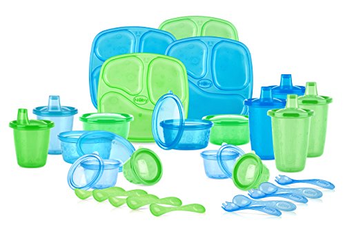 -. Feature : Set includes: 4x Section Plates, 4x 8 oz. Feeding Bowls with Sealing Lids, 4x 6 oz. Snack Cups with Sealing Lids, 4x 10 oz. Cups with Spout Lids, 2x 7 oz. Free Flow Cups with Spout Lids, 5 Feeding Spoons, 5 Forks, 1x Reusable Bag / The stackable plates, cups, and bowls make storage easy and the reusable bag is great for travel / Section plates have individual food compartments to help introduce news tastes and textures. The easy grip forks and spoons allow your child to get a firm grip while eating. / The Free Flow cups are great when babies learn to sip as the liquid flows freely. All products in the set are easy to clean and top rack dishwasher safe / 12 Months + / BPA Free