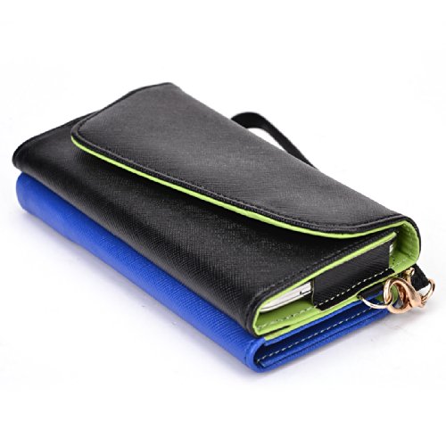 -. Feature : Money holder with 2 credit card slots / Universal smartphone compartment measures 6.60 x 3.70 x 0.50 inches / Precise real stitching / Detachable wrist and shoulder strap / Green pu leather interior