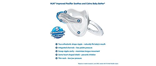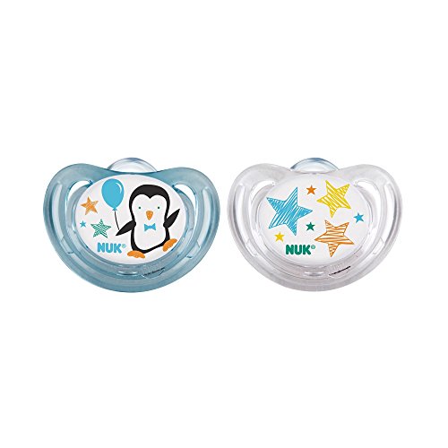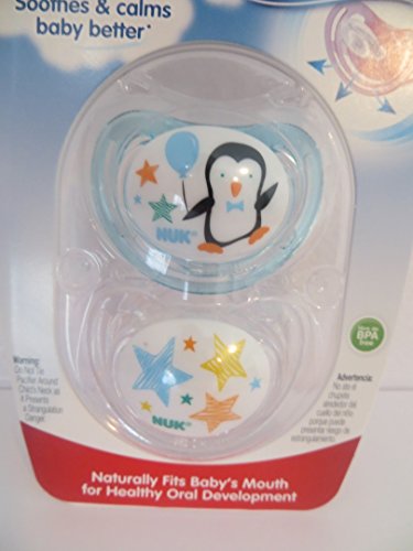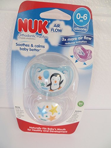 -. Binding : Baby Product -. Brand : NUK -. Color : Blue -. EAN : 0736902479971 -. Feature : You get one package that has 2 pacifiers in the package. Unique shield shape enables 3x more air flow prevents irritation, Natural-shape nipple - mimics mom's nipple / Scoop nipple cavity - maximizes tongue movement, thinner neck - less jaw pressure, / Integrated channels - less palate pressure . / Promotes proper teeth alignment by helping baby avoid thumbsucking / NUK® is the #1 selling pacifier brand in the US -. IsAdultProduct : 0 -. Label : Nuk -. Manufacturer : Nuk -. MPN : 6004R -. PackageQuantity : 1 -. PartNumber : 6004R -. ProductGroup : Baby Product -. ProductTypeName : BABY_PRODUCT -. Publisher : Nuk -. Studio : Nuk -. Title : 2 Nuk AIR FLOW Orthodontic Silicone Pacifiers NEW STYLE PENGUIN Boy 0-6 mo -. UPC : 736902479971