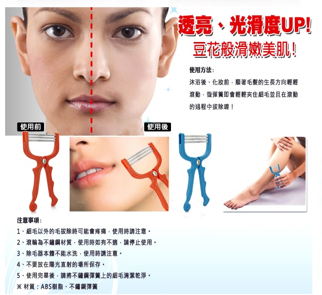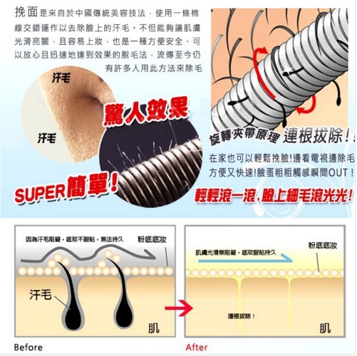 Features: Removes excess/ unwanted facial hair at the root for a longer lasting, hair-free complexion leave your skin feeling more softer, let you put on your make-up more smooth and perfect. Natural, safe and convenient. No chemical, anyone can use. It works like tweezers, except that it removes a larger area of hair at a time so it is faster.