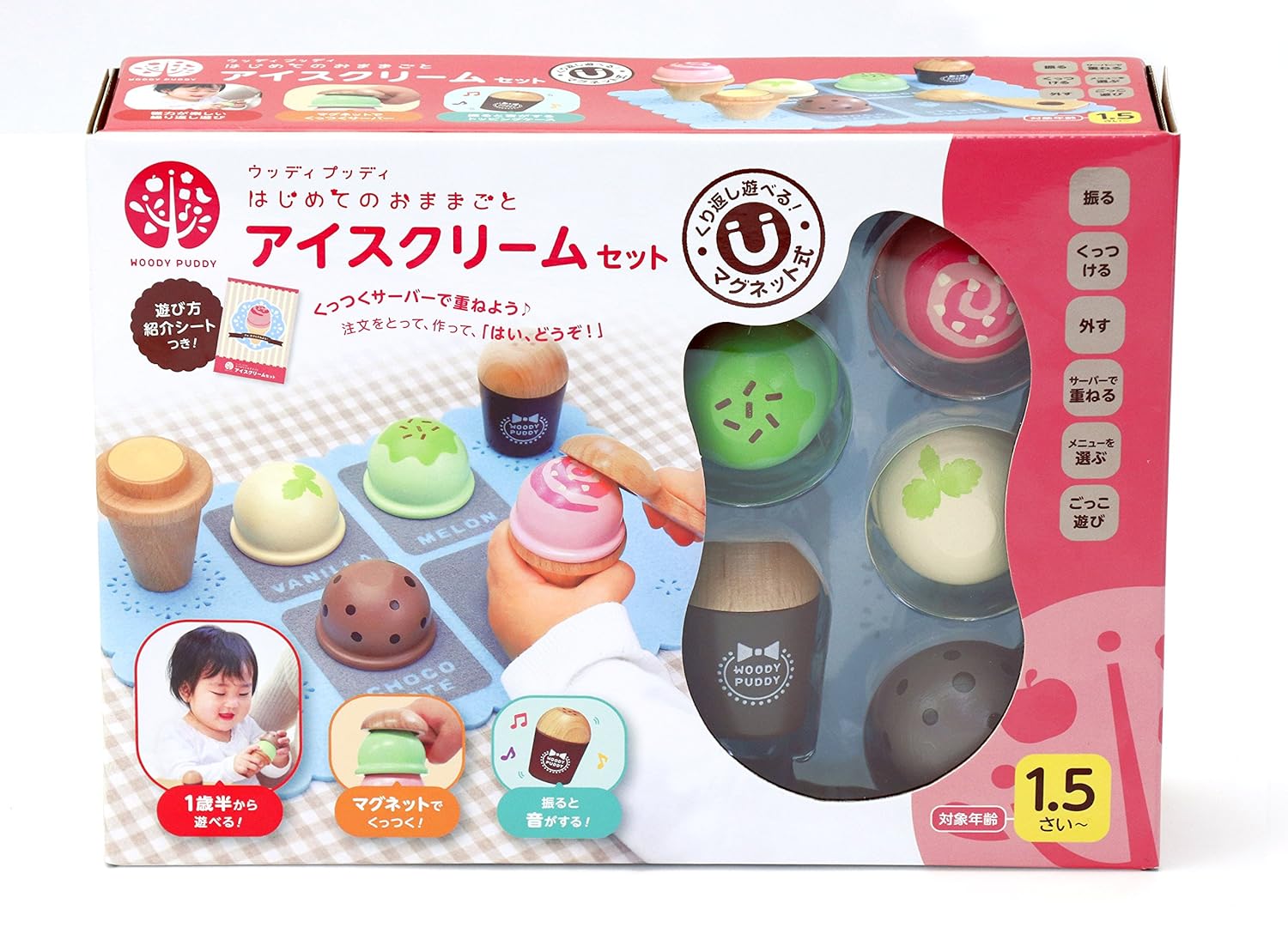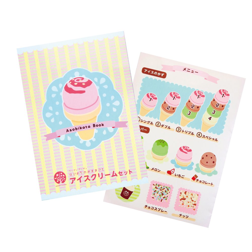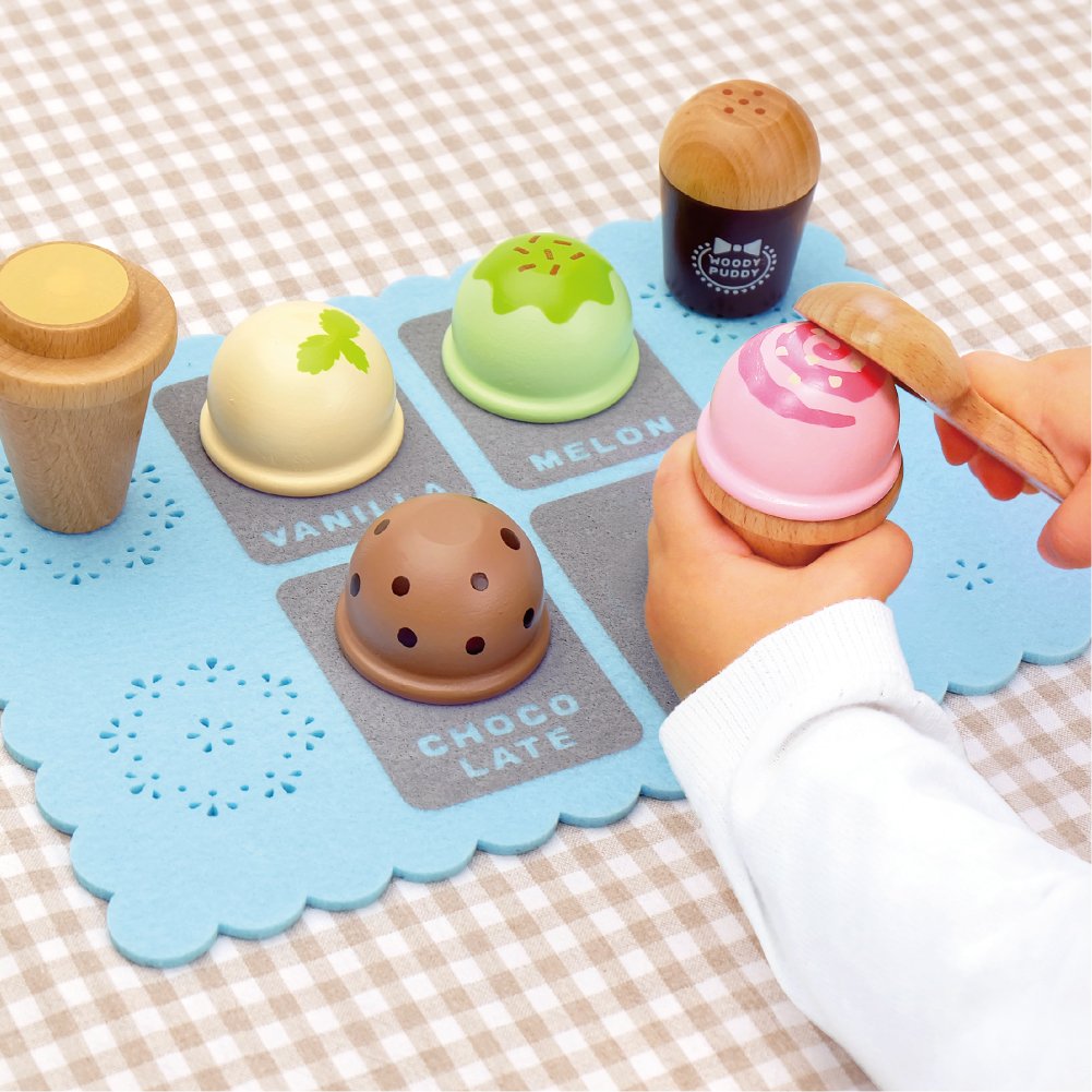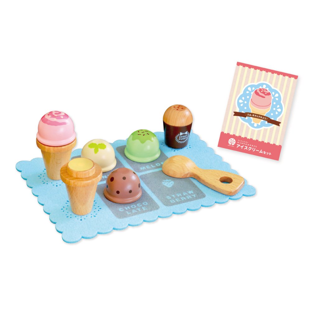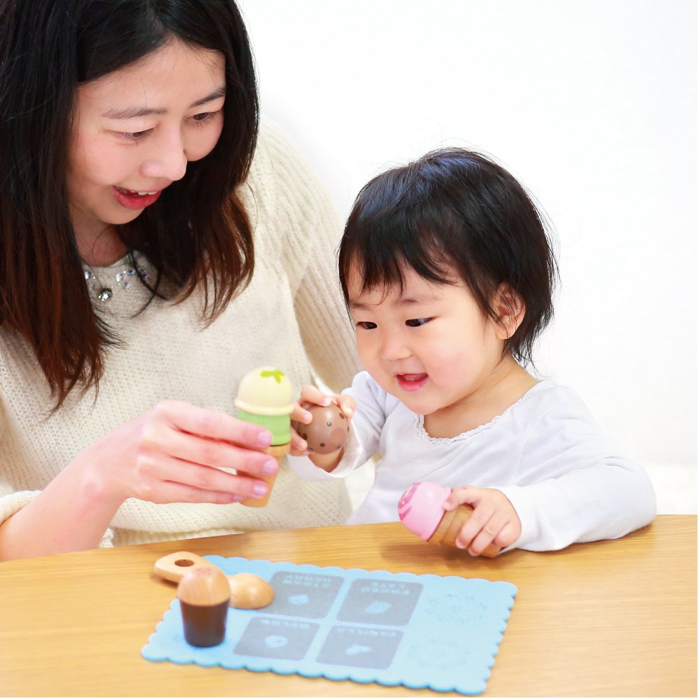 アイスサーバーでくっつき遊び! 包丁で切るよりも簡単! 1.5歳からでも繰り返し遊びが楽しめます。2.3歳になったらごっこ遊びが楽しめ、コミュニケーション力を育てます。[セット内容]バニラアイス・チョコレートアイス・メロンアイス・ストロベリーアイスコーン×2トッピングケースアイスクリームサーバーお店ごっこ用フェルトシート・メニュー&遊び方紹介シート