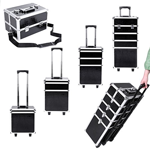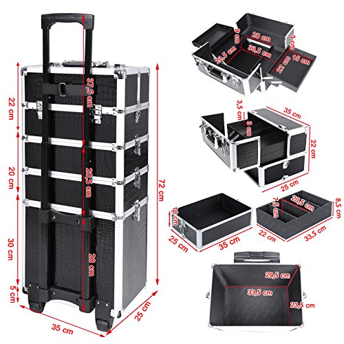 -. Feature : Robust und stabil - Metallrahmen aus Aluleiste. Die Kanten und Ecken sind verstärkt, die silberigen Scharniere sind gut gearbeitet und versprechen eine lange Lebensdauer. Verschleißfest, knickfest und stoßfest / Gute Verarbeitung - Aus MDF-Platte, Oberfläche ist Kunstleder mit Krokodilmaserung. Wasserabweisend und oxidationsbeständig. Ein Klettverschlussband an der Rückseite dient dazu, dass der Teleskopgriff sich beim Bewegen nicht stark biegt und sorgt damit für Stabilität / Geräumig und gute Aufteilung - Insgesamt 4 Ebenen: 1. ein Schmuckkoffer; 2. ein abnehmbares Fach; 3. ein Fach mit Unterteiler aus EVA-Kunststoff; 4. ein großer Kasten mit Teleskopgriff. Alles wird ordentlich aufbewahrt und bleibt griffbereit / Vielseitig einsetzbar - Das obere Teil kann man herausnehmen, und als ein separates Handgepäck benutzen; ein separater Deckel wird mitgeliefert. Sie können diesen Deckel jeweils mit den zweiten, dritten oder letzten Ebenen beliebig kombinieren / Abschließbar mit 8 Klappschlössern - Schlüssel dabei. Mit verstellbarem Tragegurt. Unter dem 1. Koffer befinden sich Bodengleiter, sodass man ihn sicher abstellen kann, und Ihre Schätzte vor Feuchte und Krazern geschützt werden
