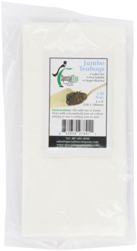 -. Binding : Kitchen -. Brand : Special Tea Company -. Color : White -. EAN : 0852659278411 -. Feature : Oversized empty tea bags / Perfect for large loose leaf tea / Fun way to share herbal teas / Heat sealable / Measures 4 x 4 Inch -. Label : Special Tea Company -. Manufacturer : Special Tea Company -. Model : 852659278411 -. PackageQuantity : 1 -. ProductGroup : Kitchen -. ProductTypeName : KITCHEN -. Publisher : Special Tea Company -. Studio : Special Tea Company -. Title : Special Tea Company 4 by 4-Inch 150-Piece Empty Tea/Herb Bags, Jumbo -. UPC : 852659278411