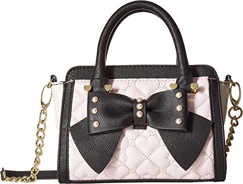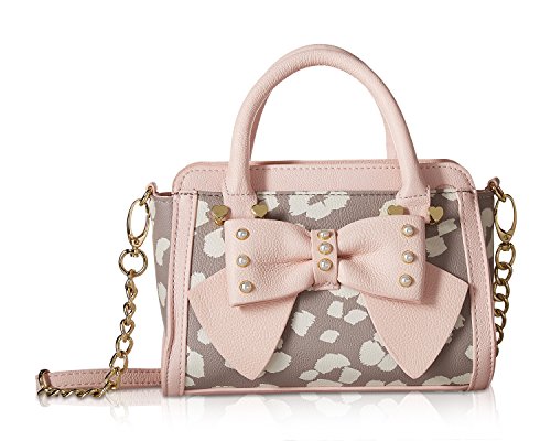 Fashion's in full bloom with this adorable bow Satchel shoulder mini crossbody bag from Betsey Johnson. Purse features PVC cheetah printed exterior, with studded Front Bow and Betsey Johnson signature hardware, Double top rolled handles with 3" drop, includes detachable Chain detailed cross-body strap with 21" drop, Double compartment zipper closure opens to fully lined interior with 1 wall zipper pocket, Compact yet great for keeping your things organized.Feature